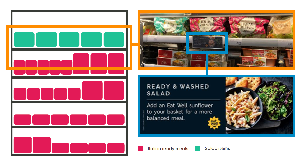 Salad items were placed in prominent locations next to Italian ready meals and labelled with the M&S ‘Eat Well’ Flower, to allow customers to easily identify products that support a balanced diet. Shelf signposting also encouraged customers to ‘add salad to their baskets for a balanced meal’.