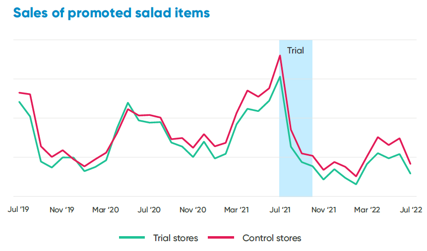 Using sales data from the retailer for 2 years prior to the intervention, the 12-week intervention period and the 9-months post-intervention, we examined the effect of placing salad items next to ready meals on salad and total fruit and vegetable sales. Interrupted time series analysis was used to quantify changes in store-level daily sales of promoted salads versus a predicted counterfactual. Analysis was repeated in control stores.