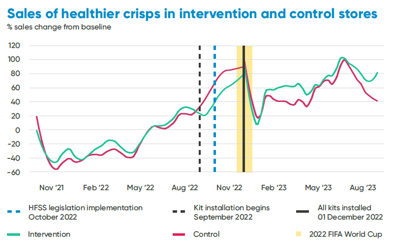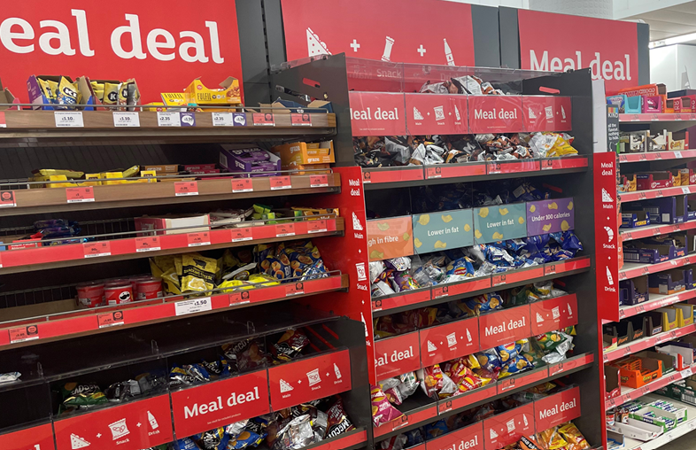 In Autumn 2022, a new in-store display was introduced into the Sainsbury’s meal deal section by one manufacturer. This intervention used health messaging on five varieties of crisps to encourage customers to choose ‘healthier’ crisp options.