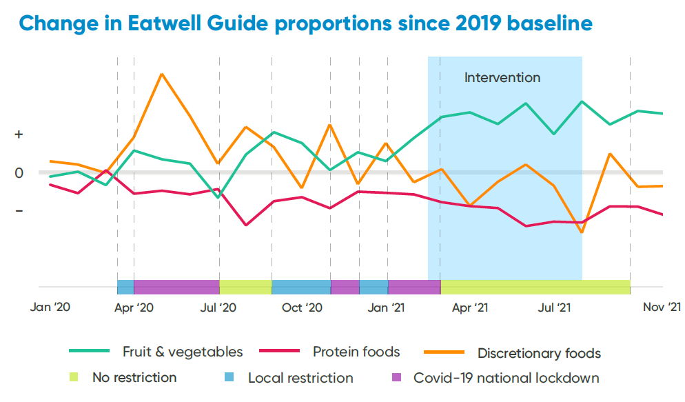 When customers used a top-up voucher, their purchases shifted postively towards the Eatwell Guide with fewer discretionary purchases and more fruit and vegetable purchases.